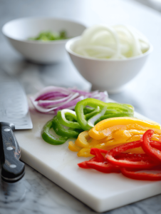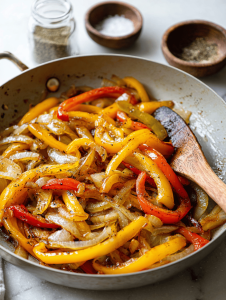 Step 2: Slice the bell peppers and onions, then sauté until caramelized, sweet-smoky aroma filling the air.