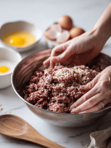 - Add beaten eggs, Worcestershire sauce, and milk to the mixture, folding everything together just until combined. The mixture should feel slightly sticky but manageable.