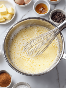 - In a large bowl, whisk the eggs and sugar together until the mixture becomes light and slightly frothy, about 2-3 minutes, and notice the color brighten.