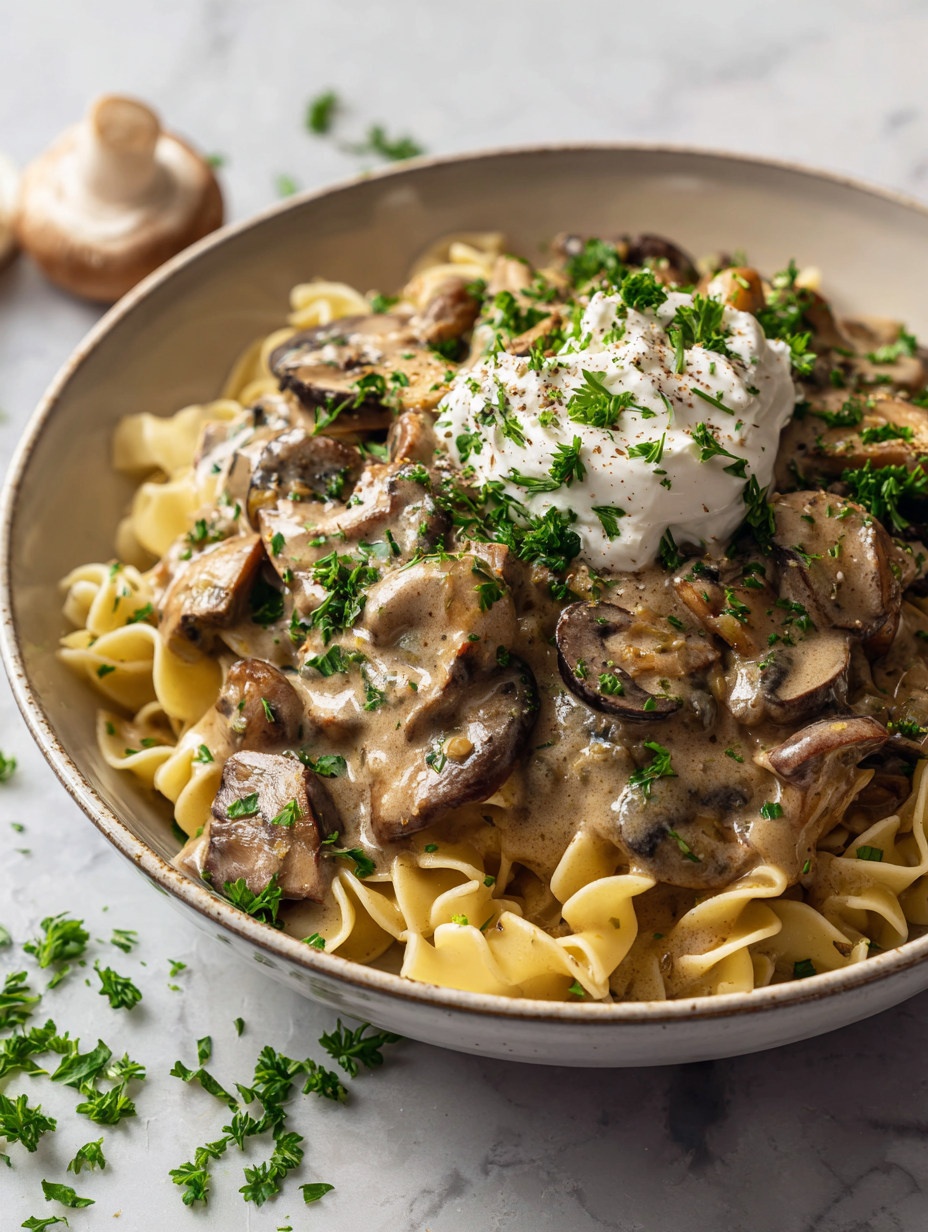 6. Let the stroganoff rest for a couple of minutes so the flavors meld and the sauce thickens further. The mushrooms should be deeply browned, and the sauce velvety and inviting. Serve hot, garnished with fresh herbs if desired, alongside crusty bread or over noodles.