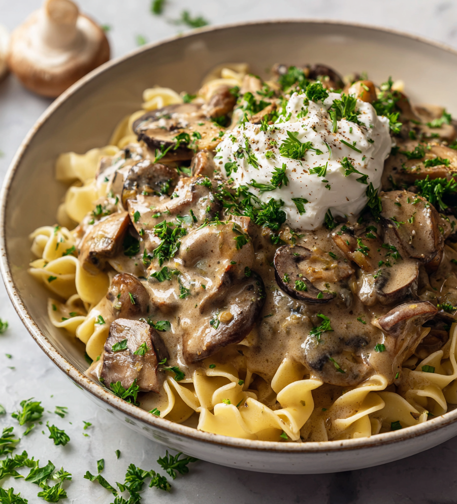 6. Let the stroganoff rest for a couple of minutes so the flavors meld and the sauce thickens further. The mushrooms should be deeply browned, and the sauce velvety and inviting. Serve hot, garnished with fresh herbs if desired, alongside crusty bread or over noodles.