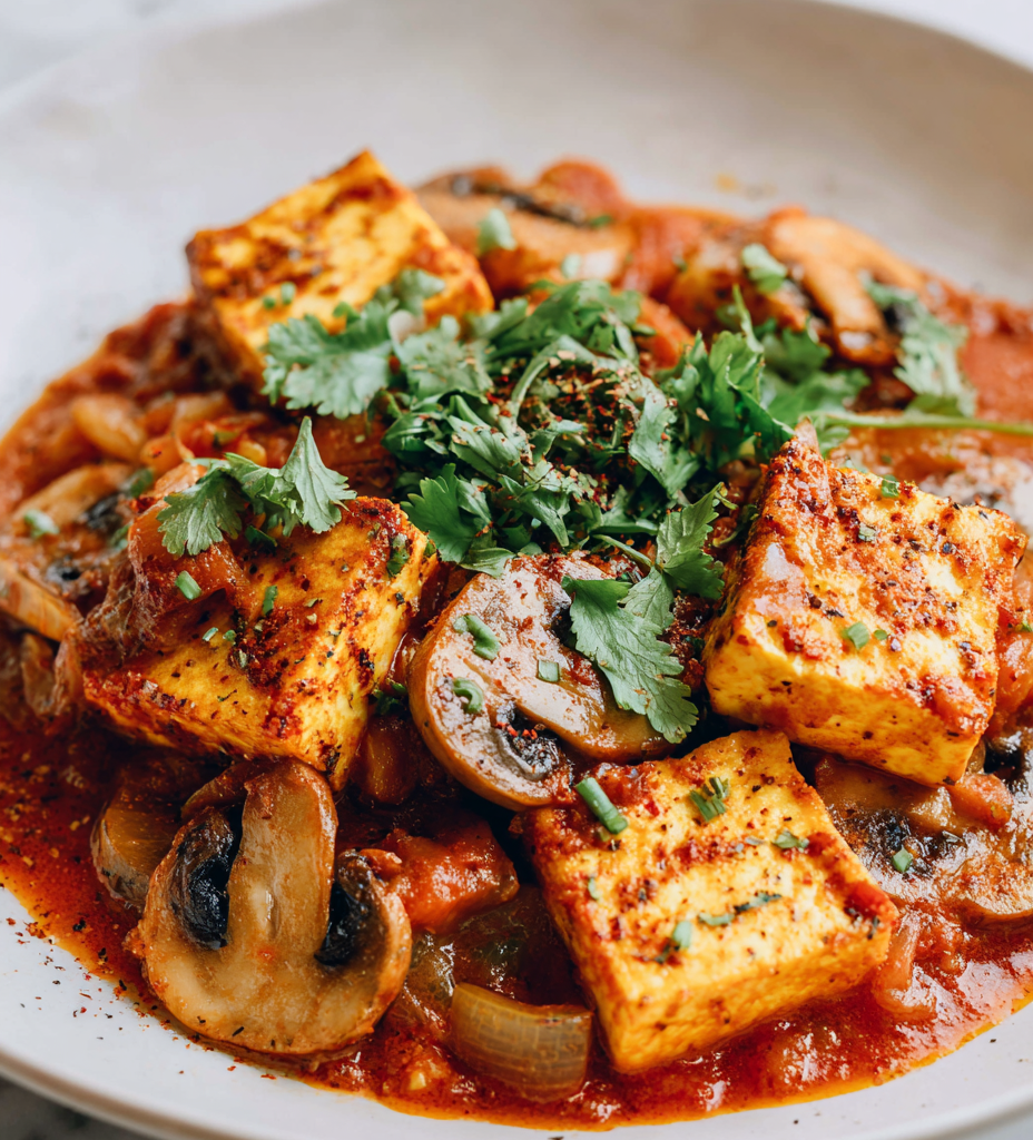 Paneer Mushroom Masala is a comforting Indian-inspired curry that combines soft paneer cubes and earthy mushrooms in a rich, spiced tomato gravy. The dish is cooked using sautéing, simmering, and gentle folding techniques to achieve a glossy, flavorful sauce with tender ingredients. It’s perfect for a cozy night in, offering a satisfying, bold flavor with a delicate, saucy texture.
