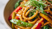 - Add sliced carrots and bell peppers to the simmering sauce. Cook for 5–8 minutes, stirring occasionally, until the vegetables are tender but still vibrant and slightly crisp.