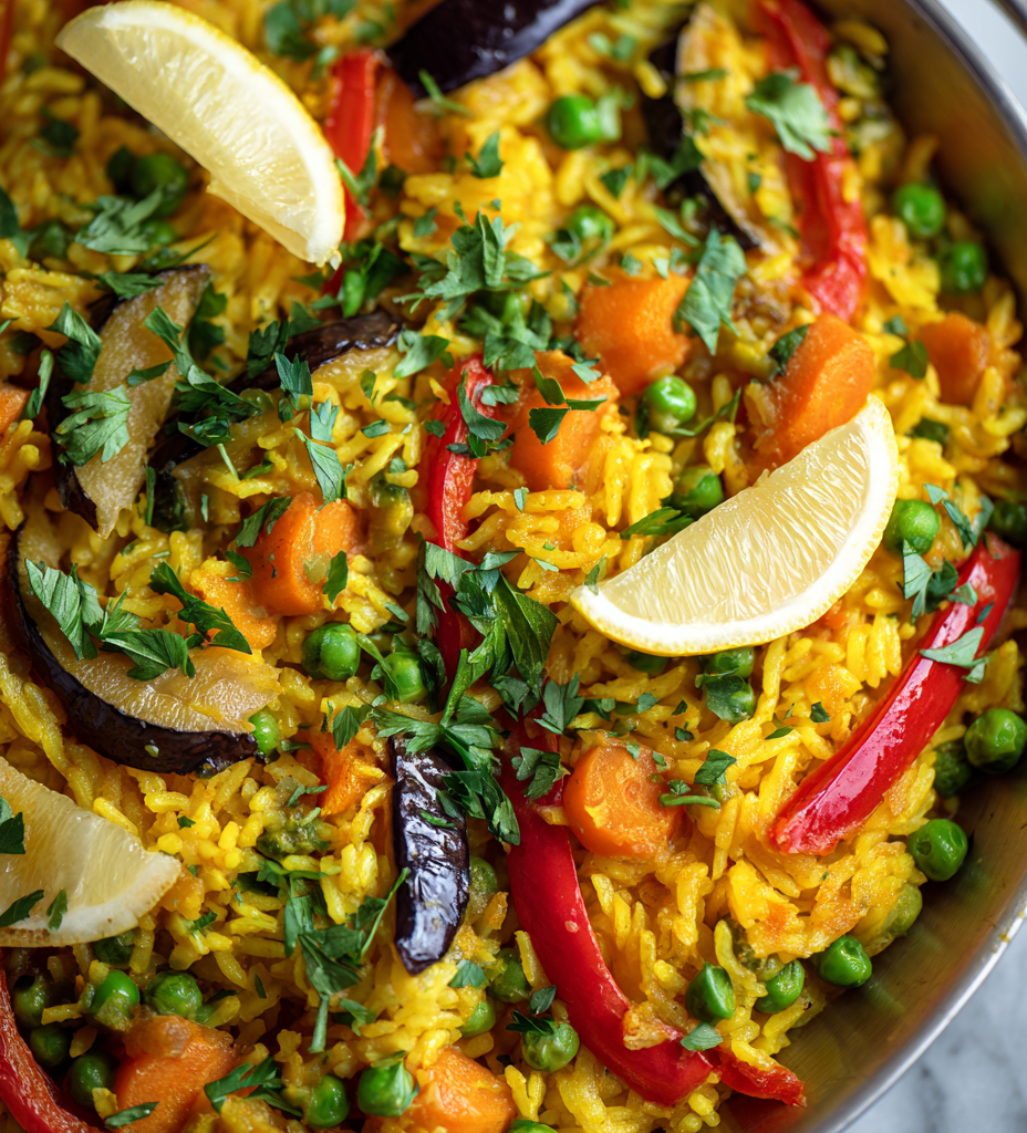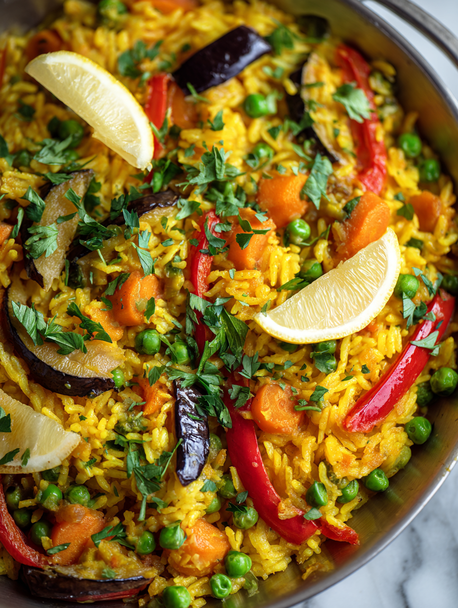 - Garnish with fresh herbs and lemon wedges, then serve directly from the pan, enjoying the vibrant colors, crispy bottom, and fragrant rice with a squeeze of lemon for brightness.