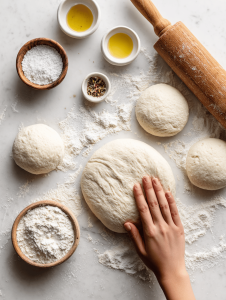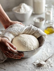 4. Shape the dough into a ball, place it in a lightly oiled bowl, cover with a damp cloth, and let it rise in a warm spot for about 1 hour, until doubled in size.