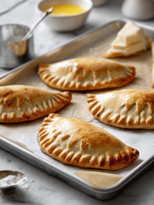 9. Brush the tops of each calzone with beaten egg to give them a shiny, golden finish. Place them on the prepared baking tray.