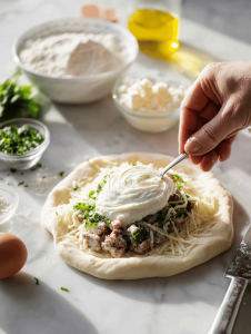 Step 6: Fill each circle with a mix of cheese, cooked sausage, and herbs—don’t overstuff.