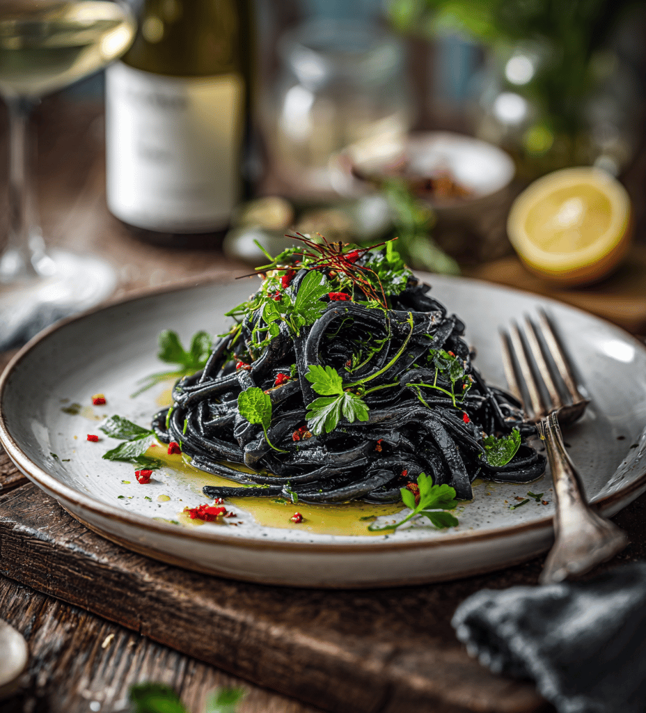 This dish isn’t just about striking color; it’s about the briny, umami punch of squid ink that cuts through the rich olive oil. A little squeeze of lemon brightens the darkness, making it feel lively and fresh. When you plate it, don’t shy from scattering chopped parsley or a drizzle of good oil — it’s all about those little accents.
