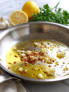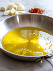 3. Add the minced garlic and a pinch of chili flakes to the skillet. Sauté for about 30 seconds until the garlic is fragrant and just starting to turn golden, and the mixture makes a gentle sizzling sound.