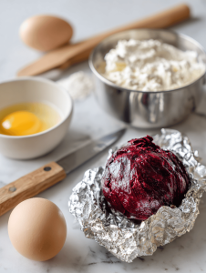 3. In a mixing bowl, combine the beet puree with the beaten egg and ricotta cheese, mixing until smooth and well incorporated. This creates a vibrant, sticky dough base.