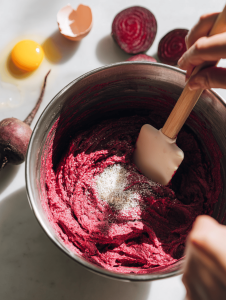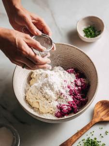4. Sift the flour over the beet mixture and gently fold it in until just combined; avoid overworking to keep the gnocchi light. The dough should be soft but manageable.