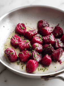 This vibrant and earthy gnocchi is made from roasted beets blended into a smooth, colorful dough. The fluffy, tender dumplings are boiled until they float and are finished in a fragrant sage butter, creating a visually striking and comforting dish with a smoky sweetness and crispy herbal accents.