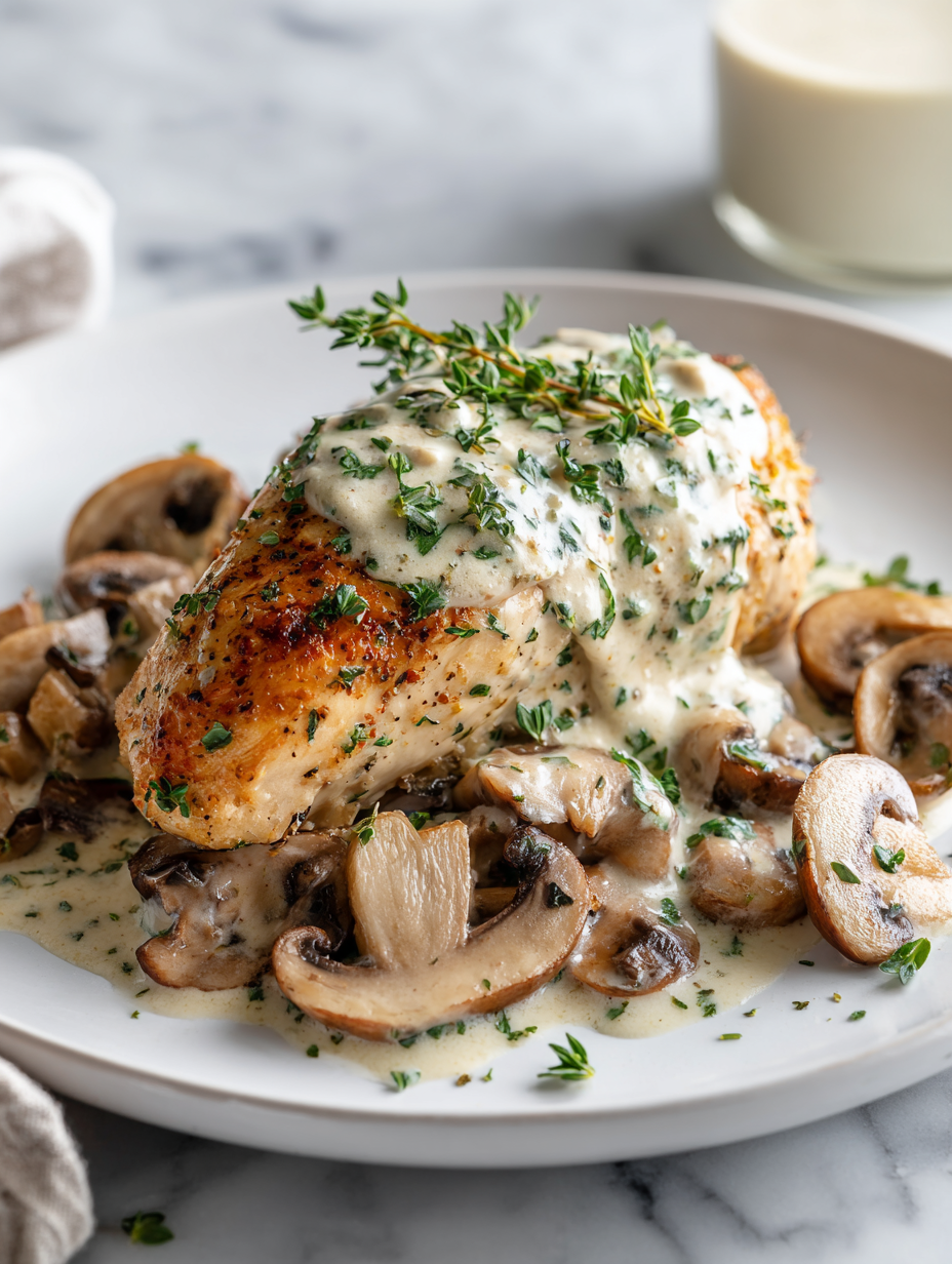 Let the chicken rest off-heat for 5 minutes, then slice or serve whole. Spoon the creamy mushroom sauce over the chicken. Garnish with fresh herbs for color and aroma.