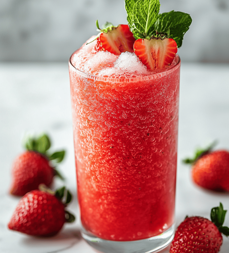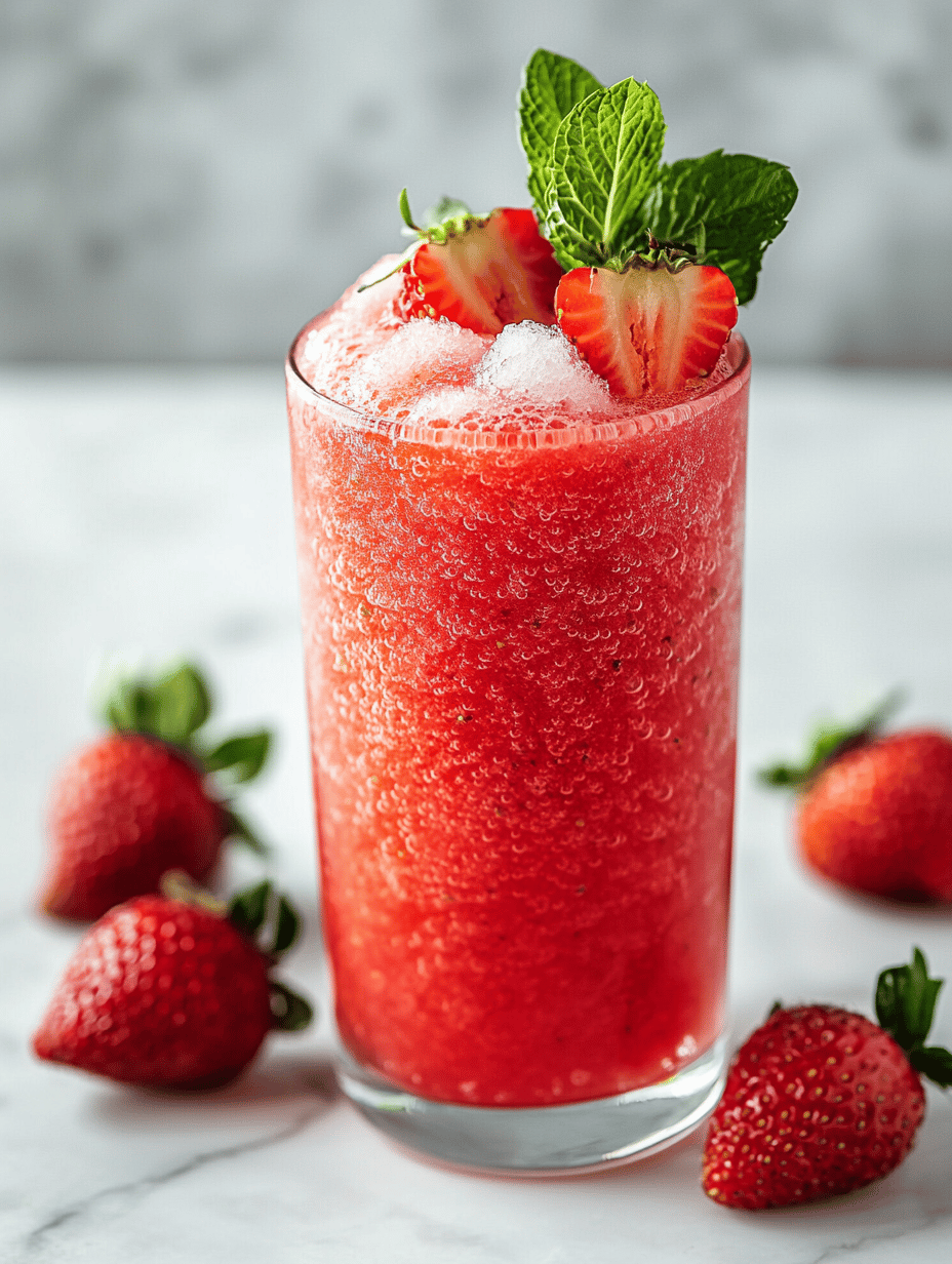 - Pour the strawberry slushie into glasses. Add a straw or garnish with a fresh strawberry or mint sprig for a colorful presentation. The final drink should look frosty, vibrant pink, and inviting.