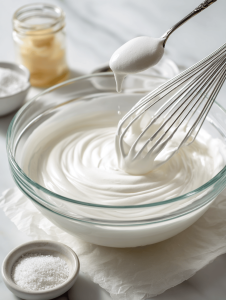 - Gradually add the caster sugar, one spoonful at a time, while beating on high speed. Listen for the sugar dissolving completely and the mixture becoming silky and smooth.