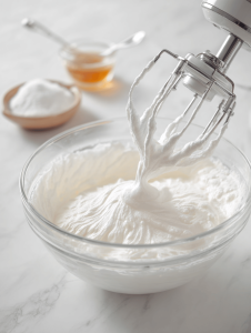 - Once all the sugar is incorporated, beat for another minute to ensure everything is well combined and the meringue is glossy.