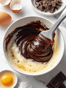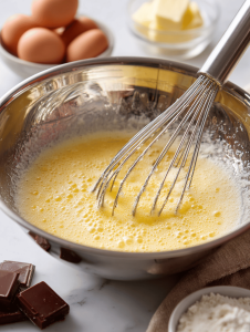 2. Chop the dark chocolate into small pieces and melt it together with the butter over a double boiler or in a microwave-safe bowl, stirring until smooth and glossy. Let it cool slightly so it doesn’t cook the eggs when added.
