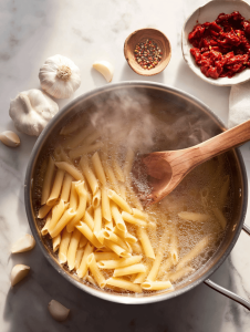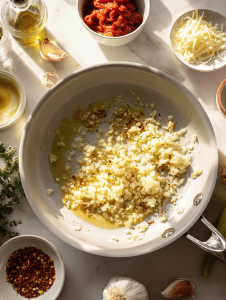 Step 3: While pasta cooks, prepare your spooky sauce: sauté garlic and onion until fragrant, then add crushed tomatoes and a pinch of red pepper for a smoky kick.