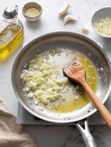 - Add the minced garlic to the skillet and cook for about 30 seconds, stirring constantly, until it turns fragrant and slightly golden, avoiding burning.