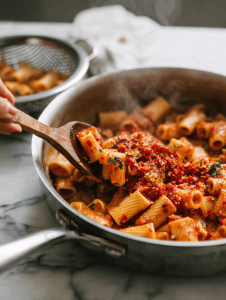- Once the pasta is cooked, drain it in a colander and then add it directly to the skillet with the sauce. Toss everything together with a wooden spoon, ensuring the noodles are coated evenly, and let it simmer together for 2 minutes to meld flavors.
