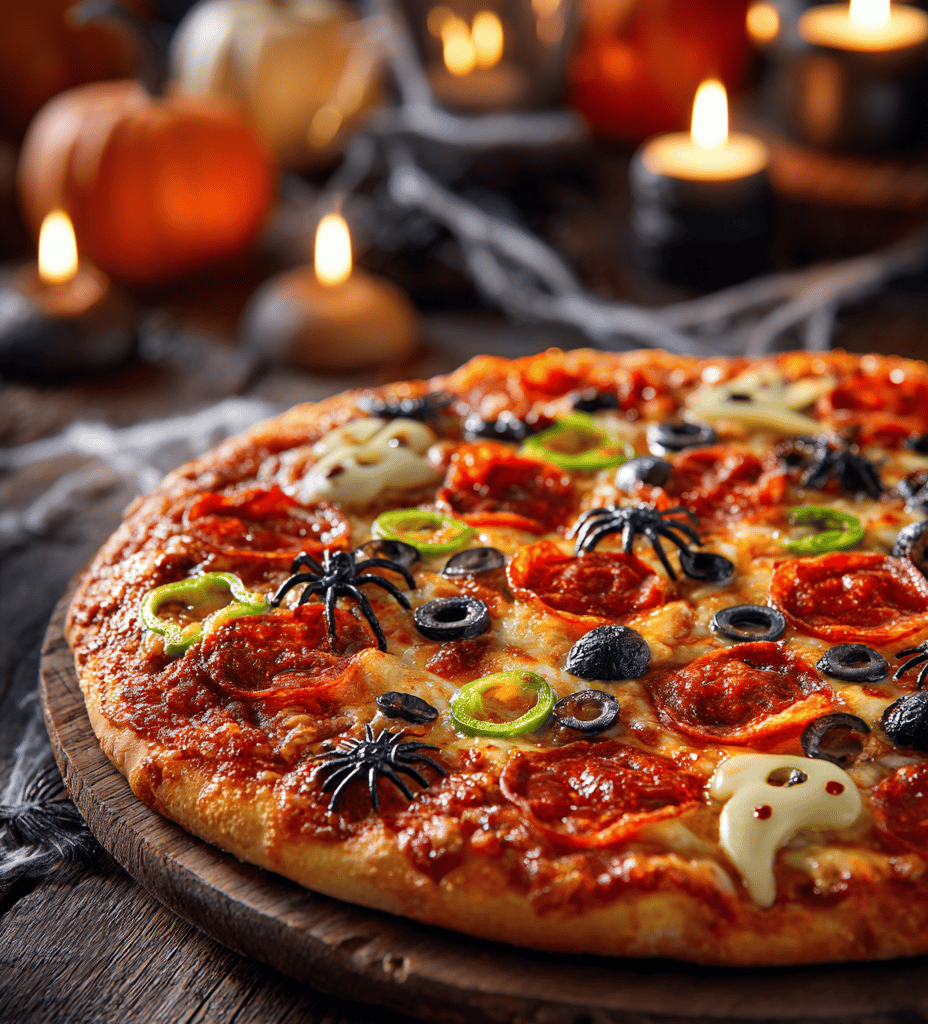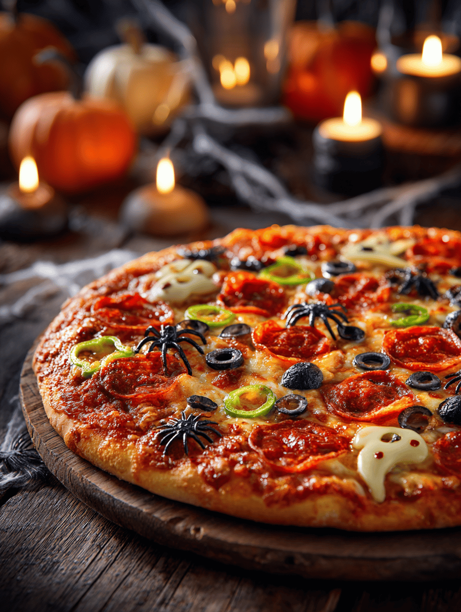 - Serve the spooky Halloween pizza warm, and enjoy the playful, chaotic feast with friends or family!