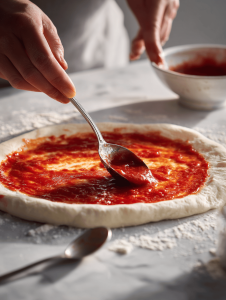 - Spread a thin, even layer of tomato sauce over the dough, leaving about 2cm (1 inch) around the edges for the crust.