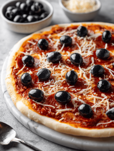 - Arrange sliced black olives on the pizza to mimic eyes, positioning them symmetrically or creatively as spooky eyes.