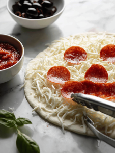 Step 4: Arrange sliced black olives for eyes and pepperoni or salami for the mouth and nose.