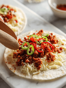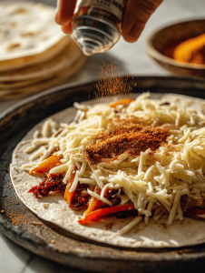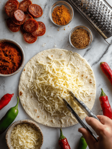 Step 2: Lay a tortilla flat, then spread a thin layer of shredded cheese and your favorite fillings—think spicy peppers, smoky chorizo, or even black beans for a dark twist.