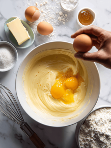 - Add eggs one at a time, beating well after each addition. Then mix in vanilla extract until evenly incorporated. The batter will become smooth and glossy.