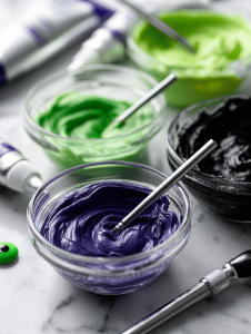 - While cookies cool, prepare your royal icing. Divide it into bowls and add food coloring to create eerie hues like green, purple, or black. Mix until vibrant and smooth.