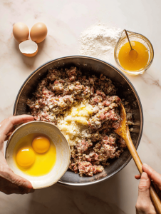 - Add beaten eggs, Worcestershire sauce, and milk to the mixture, folding everything together just until combined. The mixture should feel slightly sticky but manageable.