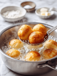 7. Drop a few dough balls into the simmering water for about 30 seconds, until they puff up and float. Use a slotted spoon to remove them.
