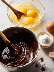 - Pour the melted chocolate and butter mixture into the egg and sugar bowl, folding gently to combine, releasing a chocolatey scent as the batter thickens.