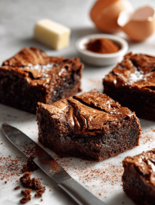 - Once cooled, cut into squares with a sharp knife, revealing a rich, moist interior with a slightly cracked, shiny top.