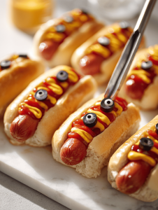 - While baking, prepare small dots of mustard or ketchup to serve as eyes. For extra fun, place small pieces of olives or cheese on top to create spooky eyes.