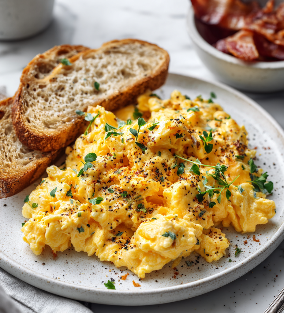 • Add a splash of cream at the end → Enhances silkiness, makes the scramble luxuriously soft without overcooking.