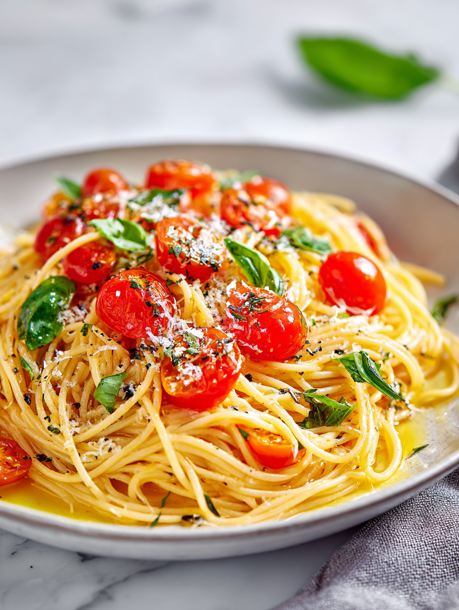 This dish highlights the beauty of fresh ingredients, featuring al dente spaghetti tossed in a warm tomato sauce infused with garlic and finished with a burst of fragrant basil. The final dish has a glossy, vibrant appearance with a tender texture and bright, herbal aroma, showcasing the perfect harmony of simple flavors and quick cooking methods.