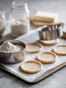 - Use a round cutter or glass to cut out circles, arranging them on a parchment-lined tray.