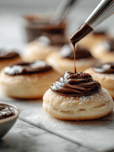 - Fill a piping bag or small spoon with jam or chocolate spread, then dollop a small amount onto the center of each donut circle, avoiding the edges.