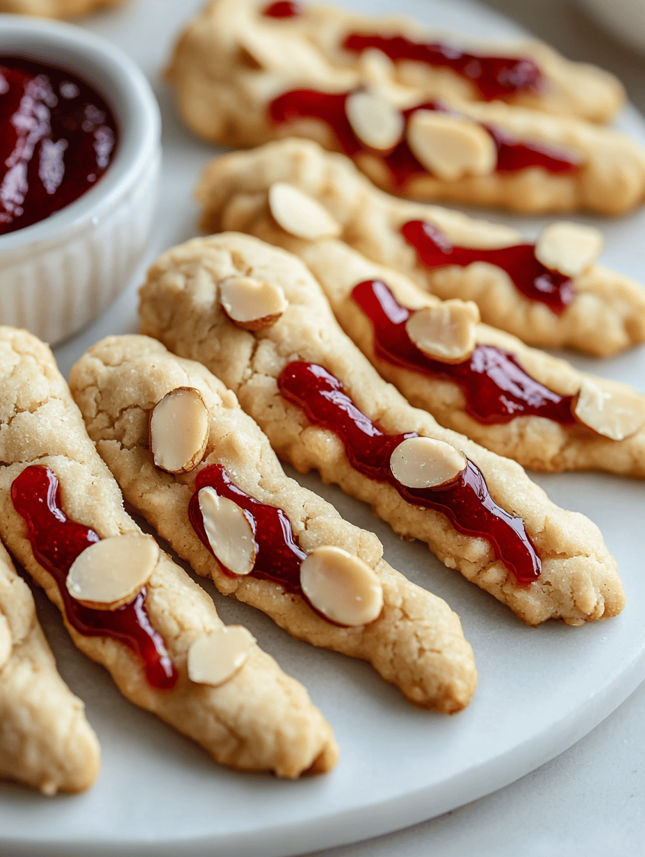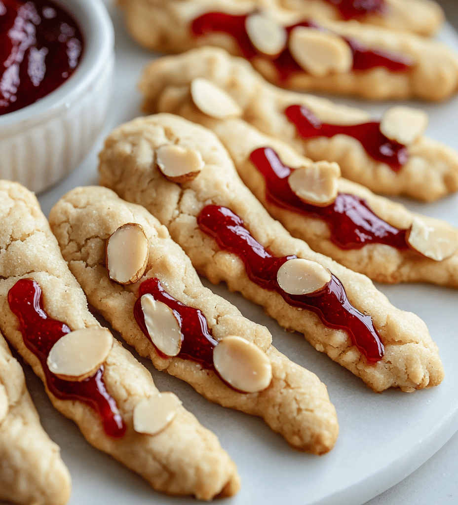 These Witch Finger Cookies are eerie, realistic-looking treats made from buttery cookie dough shaped into finger-like forms. The cookies are decorated with almond nails and red accents to resemble severed fingers, with a crispy texture on the outside and tender interior. They are baked until golden and have a spooky, detailed appearance perfect for Halloween festivities.