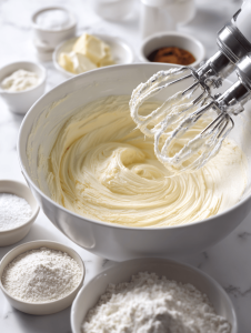 - In a separate bowl, using an electric mixer, cream the softened butter and sugar until the mixture is light, fluffy, and fragrant, about 3 minutes.
