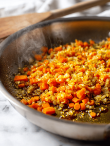 - Stir in minced garlic and chopped carrots; sauté until the vegetables soften slightly, filling the air with a savory aroma, about 5 minutes.