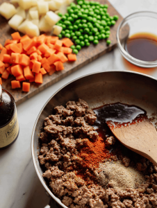 Step 4: Stir in chopped carrots, peas, and a dash of Worcestershire sauce; cook for another 8 minutes until vegetables soften.