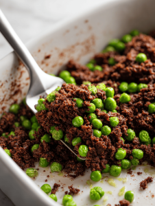 - Mix the cooked peas into the meat filling, then transfer this savory mixture into a baking dish, spreading it evenly with a spatula.
