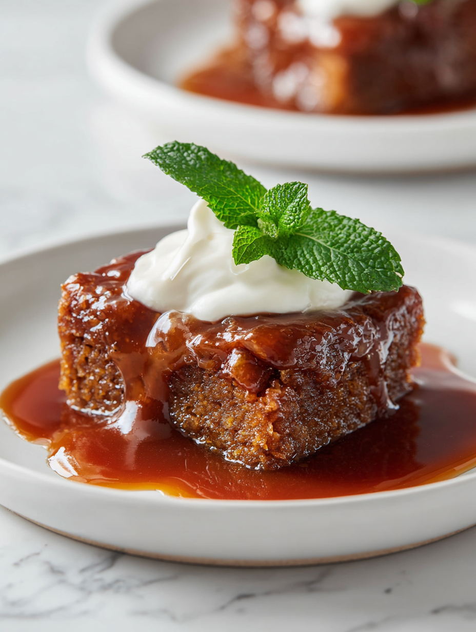 Sticky toffee pudding is a rich, moist sponge cake made with chopped Medjool dates, drenched in a luscious caramel toffee sauce. The dessert features a tender crumb and a glossy, sticky top, served warm with extra sauce and optional cream or ice cream. Its comforting texture and deep caramel flavor evoke cozy family gatherings and nostalgic evenings.