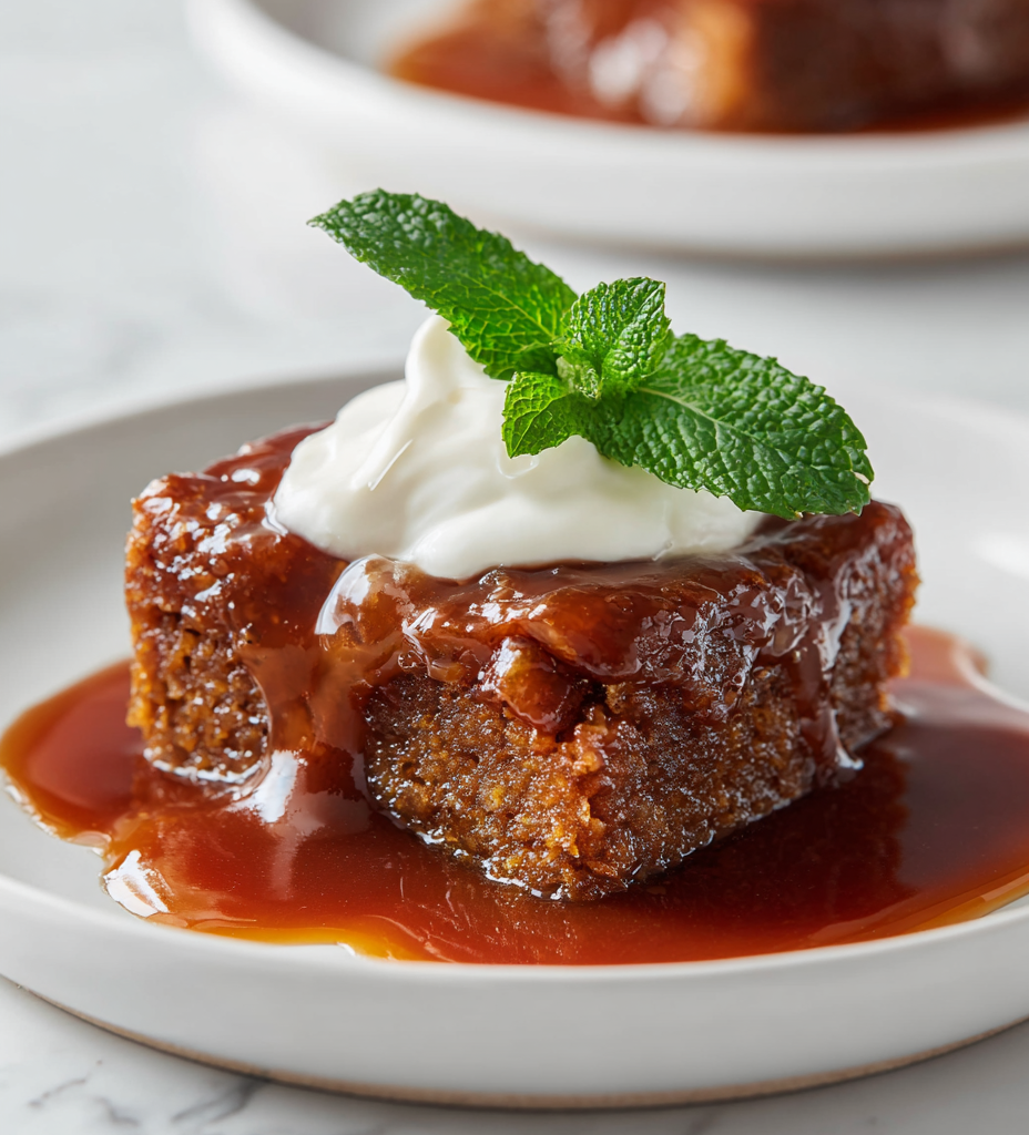 Sticky toffee pudding is a rich, moist sponge cake made with chopped Medjool dates, drenched in a luscious caramel toffee sauce. The dessert features a tender crumb and a glossy, sticky top, served warm with extra sauce and optional cream or ice cream. Its comforting texture and deep caramel flavor evoke cozy family gatherings and nostalgic evenings.