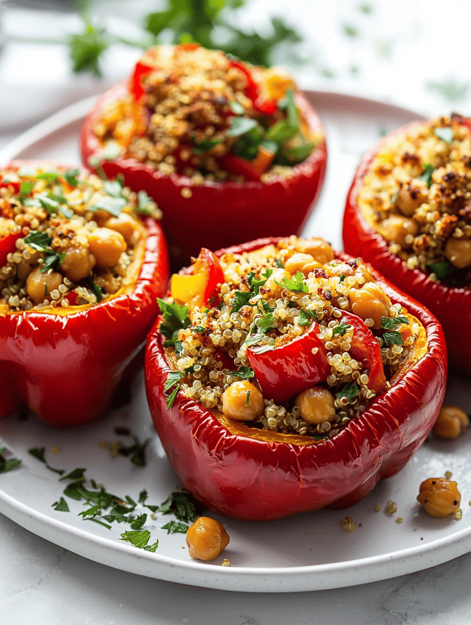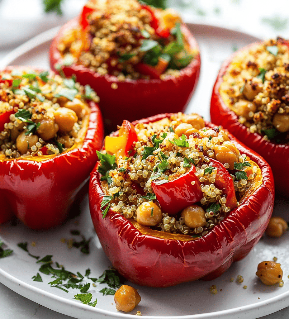 This dish features bell peppers filled with a hearty mixture of cooked quinoa, roasted chickpeas, and vegetables, then baked until tender and fragrant. The peppers develop a slightly caramelized exterior while the filling remains flavorful and textured, creating a colorful, satisfying main course with a mild smoky aroma.