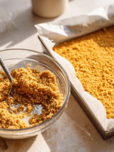 Step 2: Mix crushed graham crackers, melted butter, and a pinch of salt. Press into a 9×13 baking pan to form the crust.