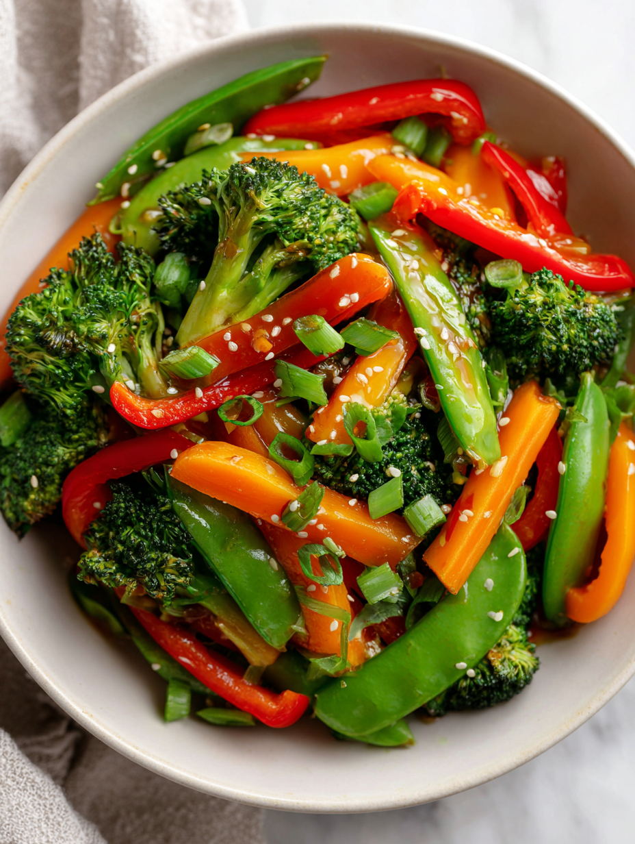 This vibrant vegetable stir-fry features crisp bell peppers, tender broccoli, and sweet carrots coated in a glossy, savory sauce. The dish is cooked quickly over high heat, resulting in colorful, crunchy vegetables with a fragrant, smoky aroma and a satisfying final texture. It’s a simple, flavorful way to turn everyday greens into a lively meal.